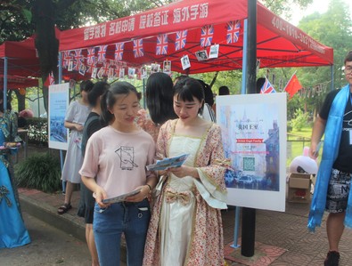 本届“红五月”英语文化艺术节以“中西文化交流”为主题,英文戏剧、英文小说、英文电影、英国王室和中国新疆、西藏、云南等省文化代表……从英语国家文化到大美中国风采,每个班级的展区都充满着文化气息,等待着同学们去感受。在一个“英式风情”的摊点上,精致的“英式”下午茶吸引了大批路人的驻足品尝,17英语(国贸)班通过独具特色的方式展示其主题“英国皇室”的魅力;17英语(国金)二班则用英文”快问快答“的方式,凸显我院特色的同时,传递着新疆的风土人情,活动现场人来人往,热闹非凡,欢声笑语不断。