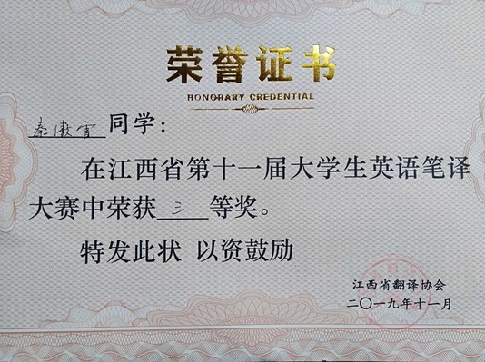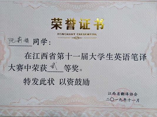 11月3日,江西省第十一届大学生英语笔译大赛在南昌大学顺利举行。来自南昌大学、江西师范大学、太阳集团等27所院校和独立学院共计374名选手参加了本次比赛,我院三名学生在决赛中表现优异,喜获二等奖2项,三等奖1项。