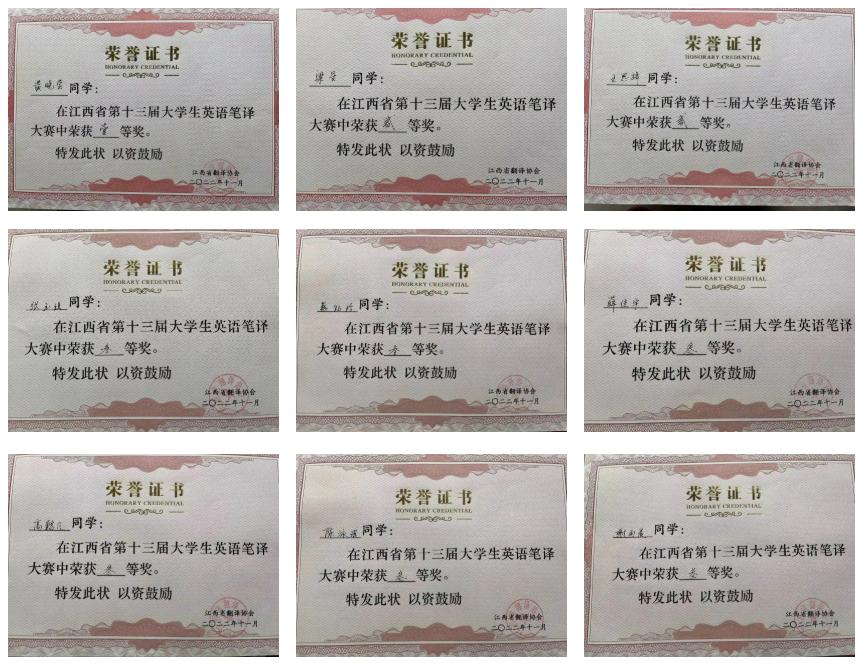 11月13日,江西省第十三届大学生英语笔译大赛在南昌大学落下帷幕。我院学子与来自南昌大学、江西师范大学、江西财经大学等20多所高校共200余名选手(含研究生)同台竞技。我院19级翻译专业本科生黄晓莹荣获一等奖,梁星、王思旖获二等奖,张玉琪、蔡钰玲、薛佳宇、高懿凡、陈泳琪、谢雨晨获三等奖。