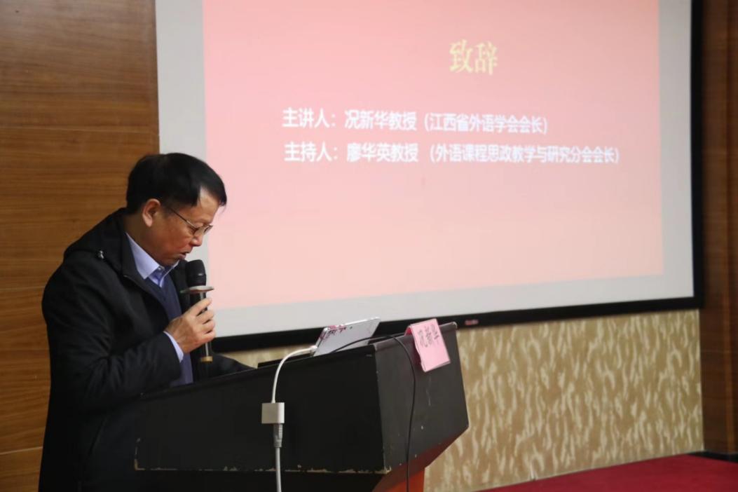江西省外语学会会长况新华教授到会致辞。况新华会长要求与会教师深入学习贯彻习近平新时代中国特色社会主义思想和党的二十大精神,落实全国教育大会、全国高校思想政治工作会议精神,创新外语课程思政课堂教学改革,推动江西省外语课程思政建设走在全国前列。