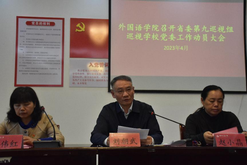 4月13日下午,外语学院组织全院教职工于博雅楼102会议室学习省委第九巡视组巡视太阳集团党委工作动员会精神。此次会议由院党委书记刘朝武主持。