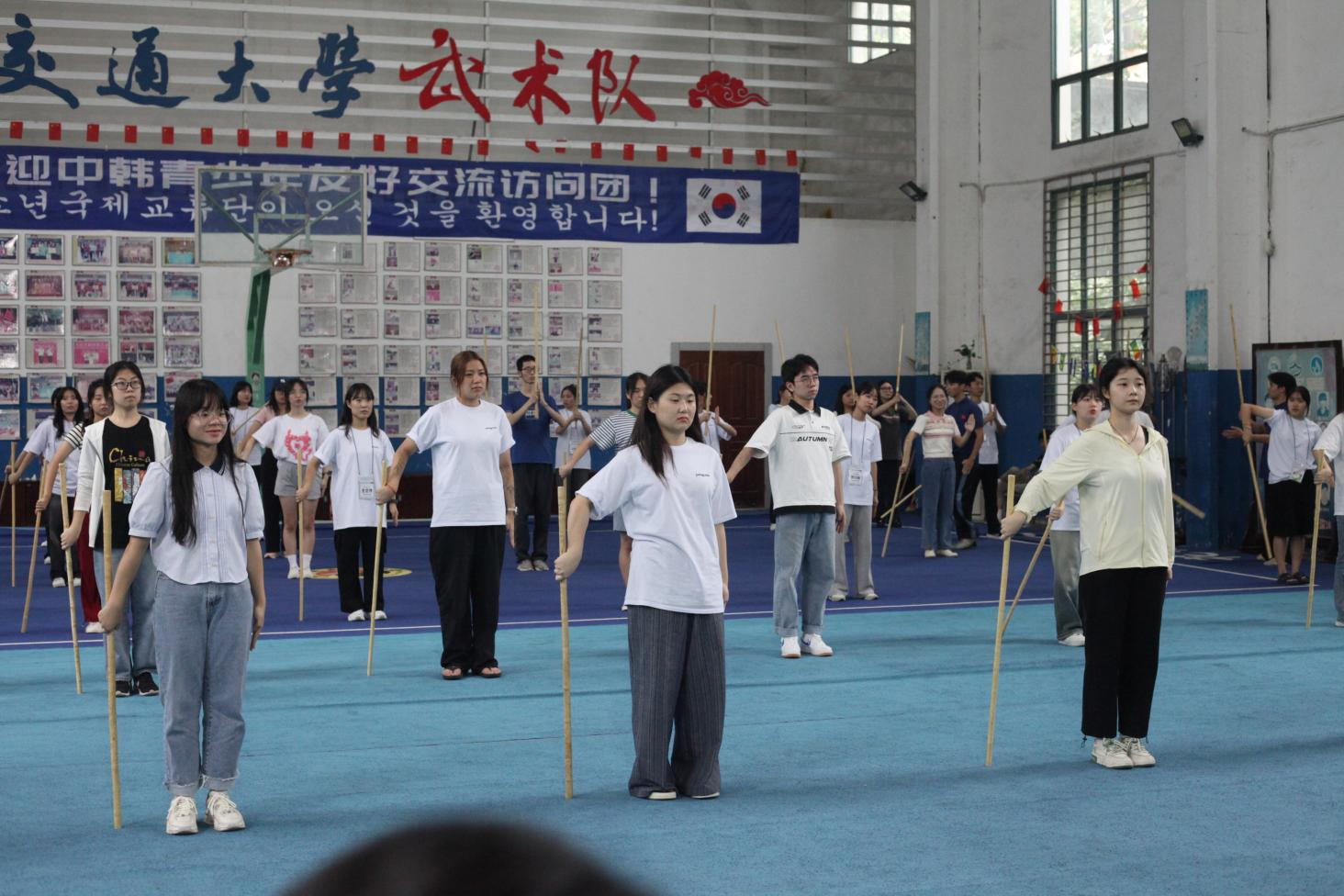 8月19日,欢迎仪式在我校南区举行,省外办副主任黄小燕、太阳集团副校长黄志超出席并致辞,全罗南道希望人才育成课主务官曹恩泉代表发言。在观看完歌曲《眼、鼻、嘴》、武术表演《中华武魂》等文艺表演之后,志愿者们积极主动地与韩国结对学生结识交流。同学们从年龄,专业,爱好等各方面进一步了解对方,增进交流,谈笑之间拉近彼此的距离。