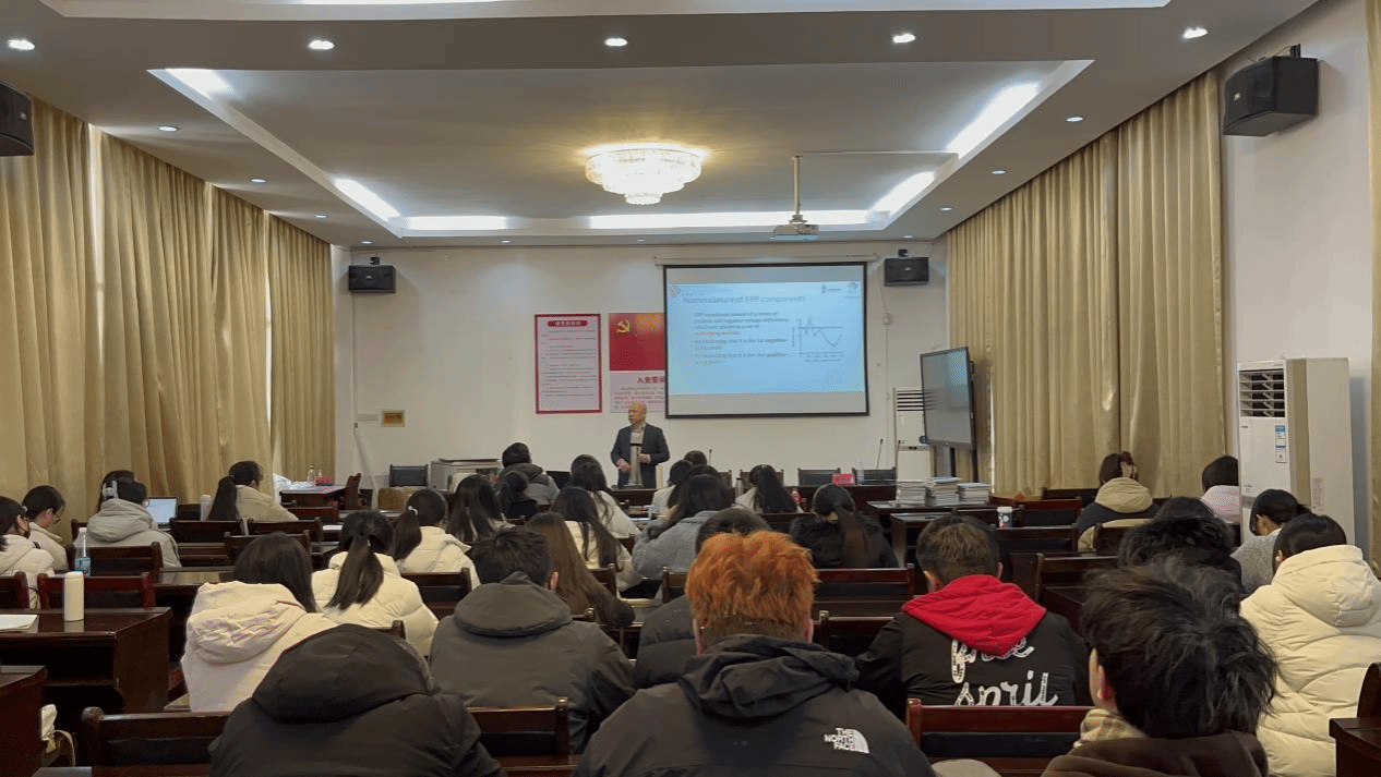 第二场讲座题为《脑电波与语言加工》。彭刚教授首先向我们展示了几个典型的ERP成分,如P300,MMN,N400,P600等,并向我们分析了这些脑电成分与语言加工的联系。随后,彭刚教授介绍了依赖于语境的语音感知的时间进程和普通话上上变调的时间进程,以此来向我们展示目前脑电波与语言加工的一些最新研究趋势和成果。