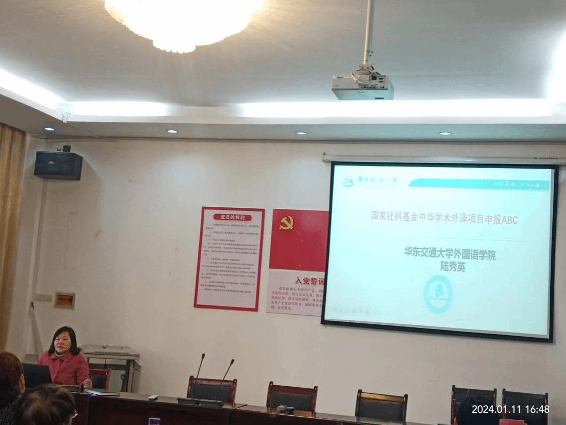 最后,陆秀英教授全面详细地讲解了国家社科基金中华学术外译项目的项目宗旨、资助范围、项目类别与资助额度、申请要求以及申报程序。