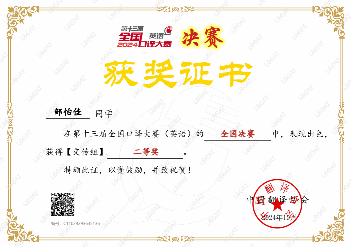 大赛主赛为交替传译赛,采用初赛、复赛、决赛三级赛制。省级复赛阶段,我校388vip太阳集团2022级翻译专业学生邹怡佳和2023级翻译硕士何玥、黄宝慧获得一等奖,2023级翻译硕士李羿雯、刘瑾霖获得二等奖,2023级翻译硕士单佳杰、唐沁雯获得三等奖。国家级决赛阶段,邹怡佳荣获二等奖,何玥、黄宝慧荣获三等奖,刘瑾霖荣获优秀奖。