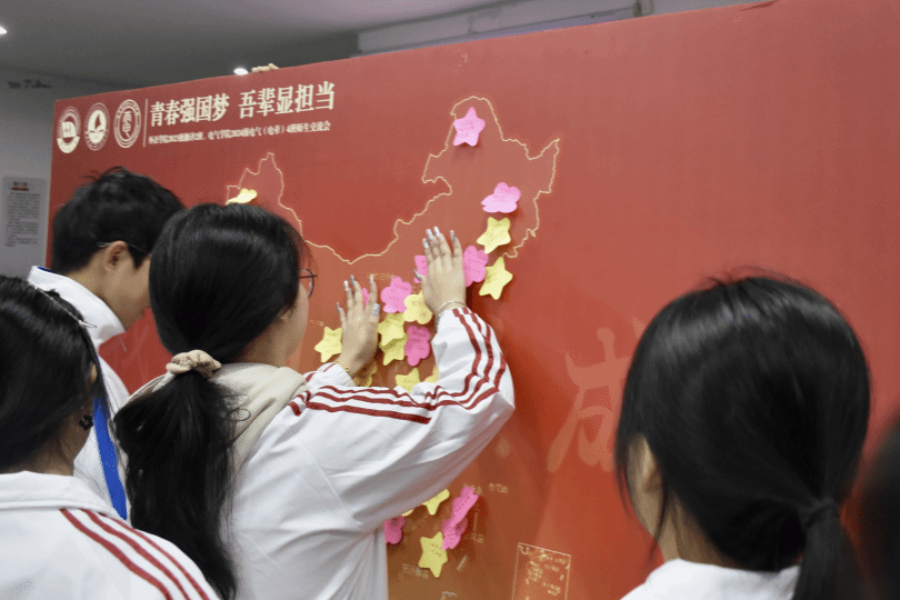 当《Dream It Possible》的旋律响起,整个会场都沉浸在一片深情的氛围之中。师生们纷纷拿起星星便利贴,认真地写下自己奋斗努力的目标与对祖国的真挚祝福,并将其贴在中国地图上。每一个音符都是同学们跳动的爱国之心,每一颗星星都是同学们对未来的美好祈愿。