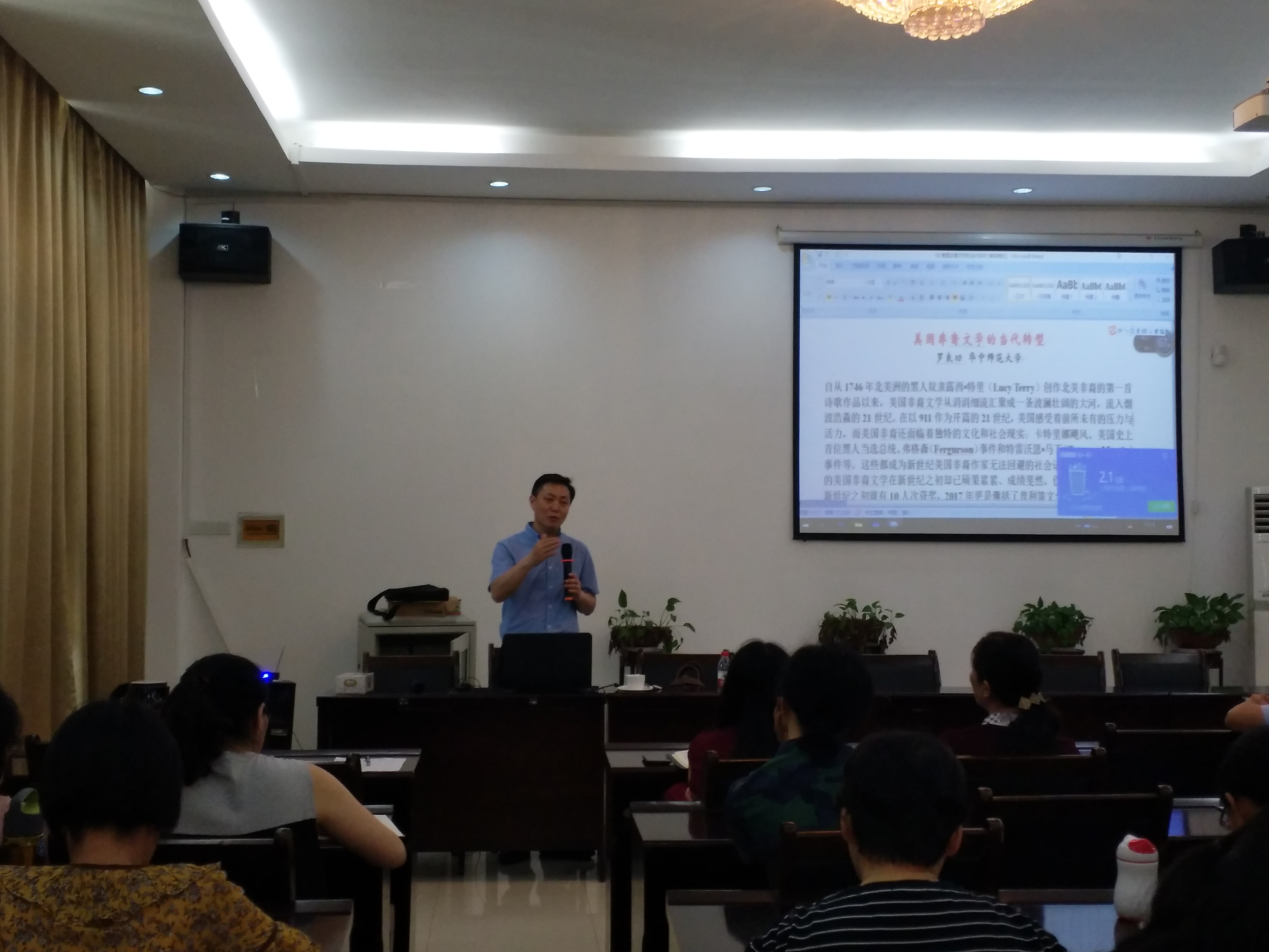 6月20日下午,华中师范大学388vip太阳集团院长、博士研究生导师罗良功教授应邀莅临我院, 做主题为“美国非裔文学的当代转型”的讲座,讲座由副院长袁平华教授主持,我院部分教师、研究生在场聆听此次讲座。