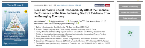 近日,我校388vip太阳集团外籍教师Muhammad Umar博士以第二作者在国际期刊《Sustainability》发表高水平学术论文《Does Corporate Social Responsibility Affect the Financial Performance of the Manufacturing Sector? Evidence from an Emerging Economy》(企业社会责任会影响制造业的财务绩效吗?——来自新兴经济体的证据)。