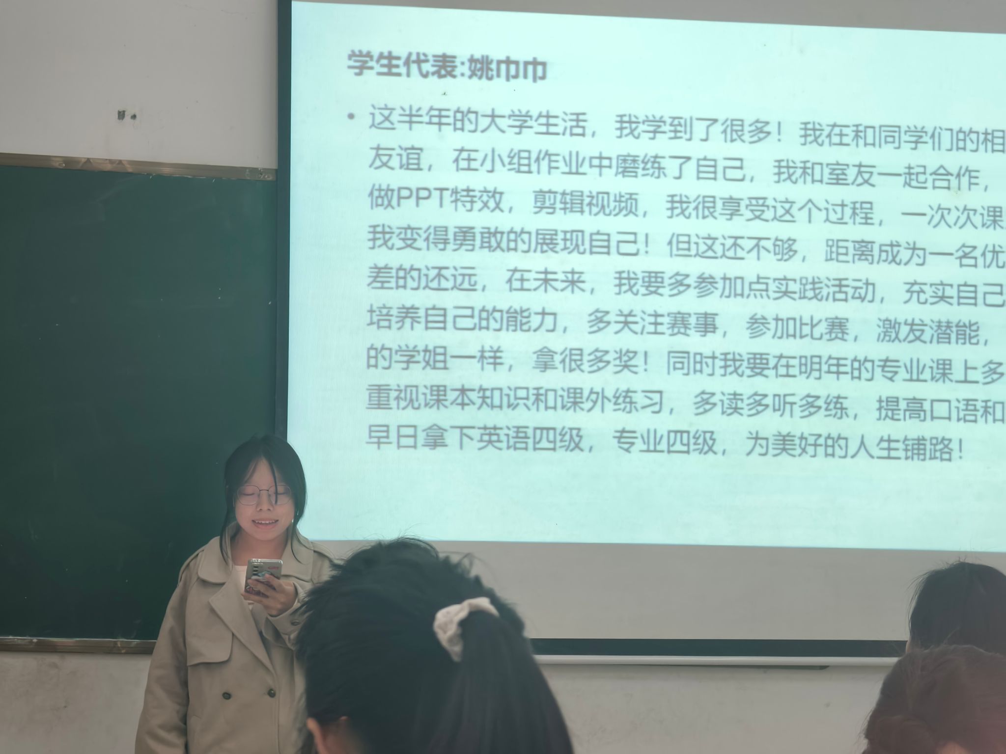 随后,姚巾巾同学作为班级学生代表,汇报了自己自入学以来的学习、生活。