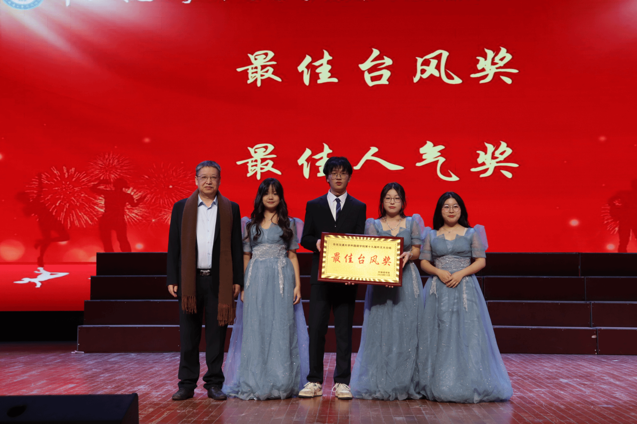 “用尽全力想将结局改变,哪怕只和你说声你好”“我明白你的痛苦与恐惧,我会成为你的灯塔,让你安然无恙”在精彩的合唱展示和角逐之后,葡萄牙语2023-1班、英语(国际贸易)2023-2班,英语(英西复语)2023-1班、英语(国际贸易)2023-1班获一等奖;翻译2022-1、翻译2022-2班,翻译2023-1班、翻译2023-2班,翻译2024-1班、翻译2024-2班获二等奖;英语(国际贸易)2022-1班、英语(国际贸易)2022-2班,葡萄牙语2022-1班、英语(英西复语)2022-1班,翻译硕士2023-1班、翻译硕士2024-1班,葡萄牙语2024-1班、英语(英西复语)2024-1班,英语(国际贸易)2024-1班、英语(国际贸易)2024-2班获三等奖