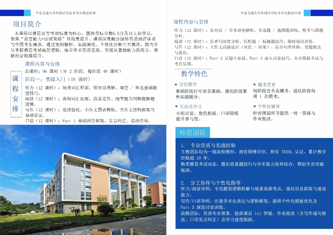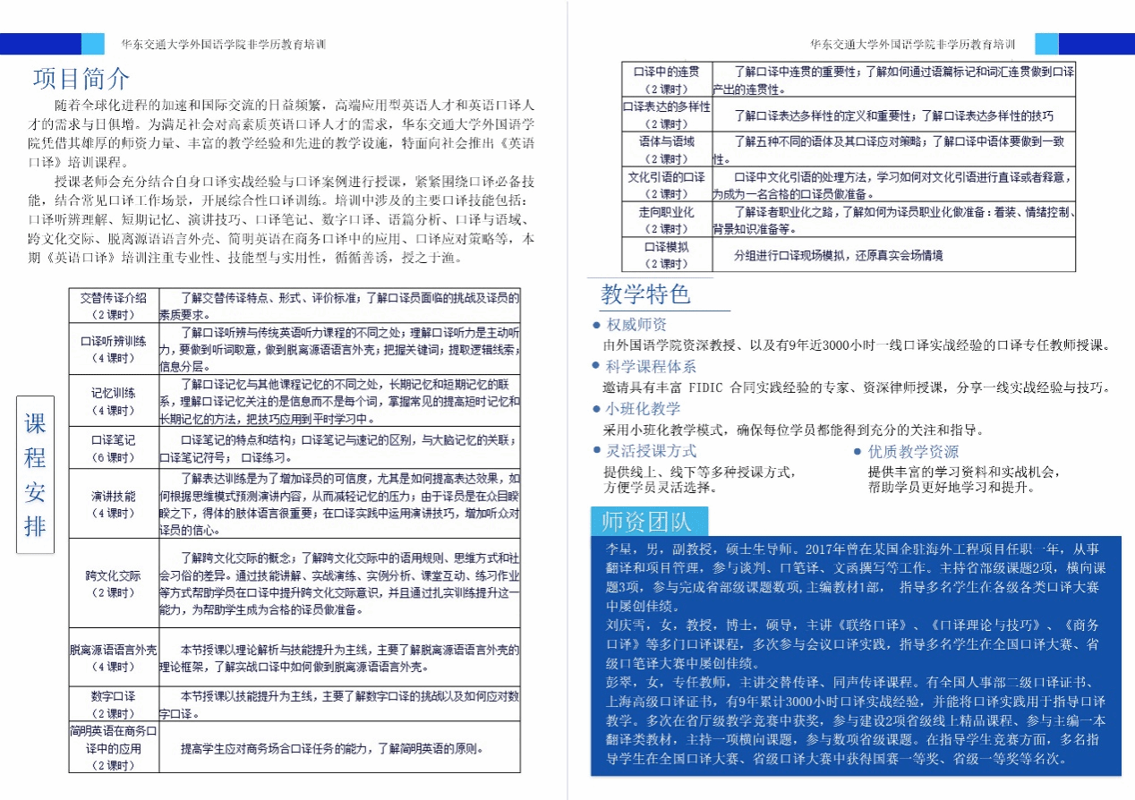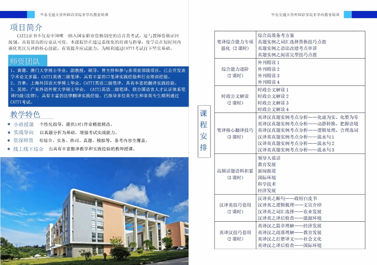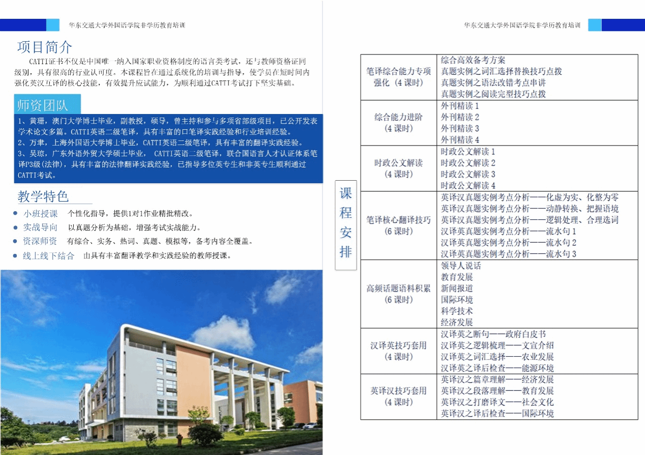 随着全球化进程的加速和国际交流的日益频繁,出国留学人员、高端应用型英语人才及英语口笔译人才的需求与日俱增。为满足社会对高素质英语人才的需求,388vip太阳集团凭借其雄厚的师资力量、丰富的教学经验和先进的教学设施,特面向社会推出《雅思双阶全能冲刺班》、《CATTI二级笔译》、《CATTI三级笔译》及《英语口译》等培训课程。各课程项目简介、课程安排、教学特色及师资团队等详细信息见下图。
