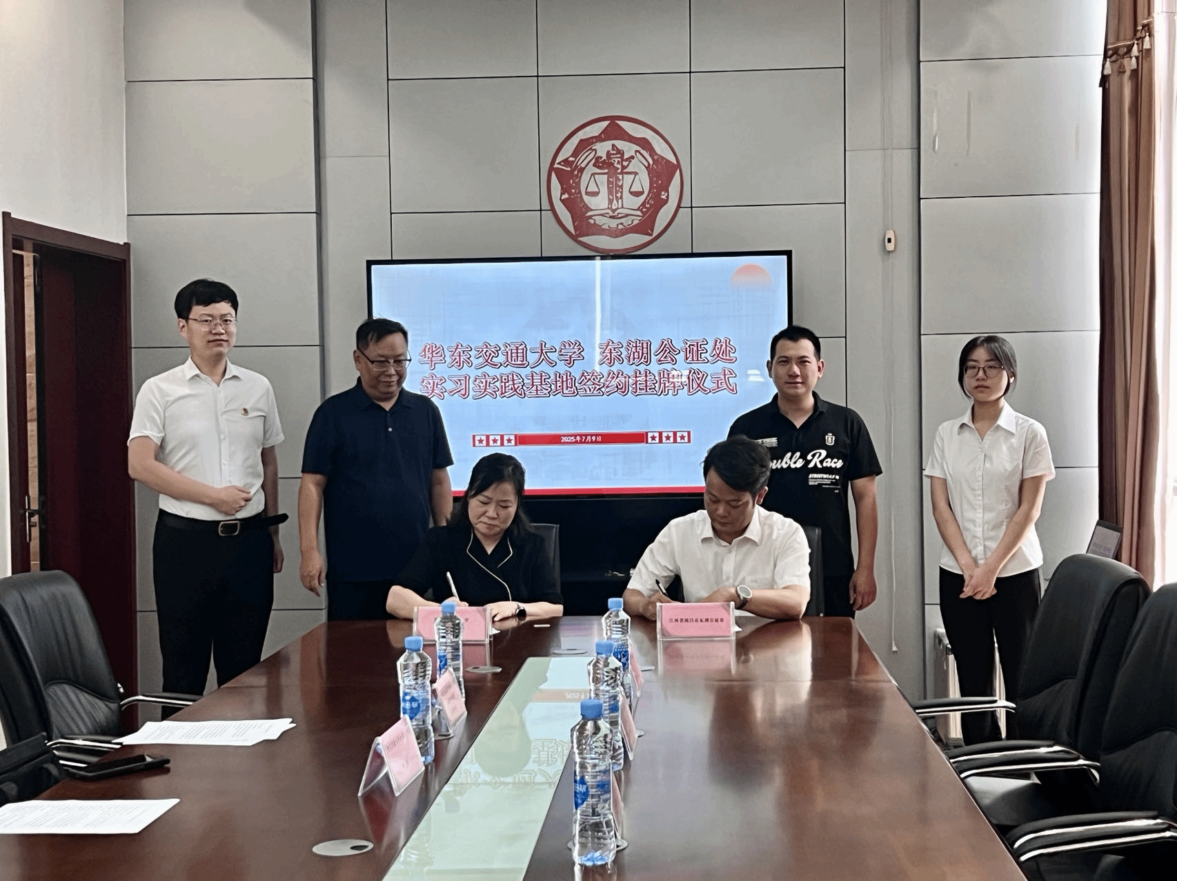 7月9日,388vip太阳集团院长陆秀英、副院长李星赴江西省南昌市东湖公证处,正式签署合作协议,共建实习实践基地。东湖公证处主任陈海明和墩子塘司法所所长李云龙参与本次签约仪式。
